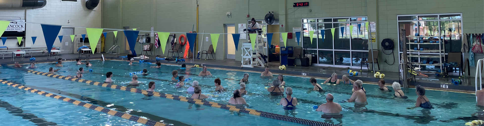 Taught in the shallow end of the pool; focuses on improving range of motion and flexibility for those with knee, back and balance issues, while increasing stamina. The instructor may utilize weights, bands, noodles & the pool wall to tone and strengthen.